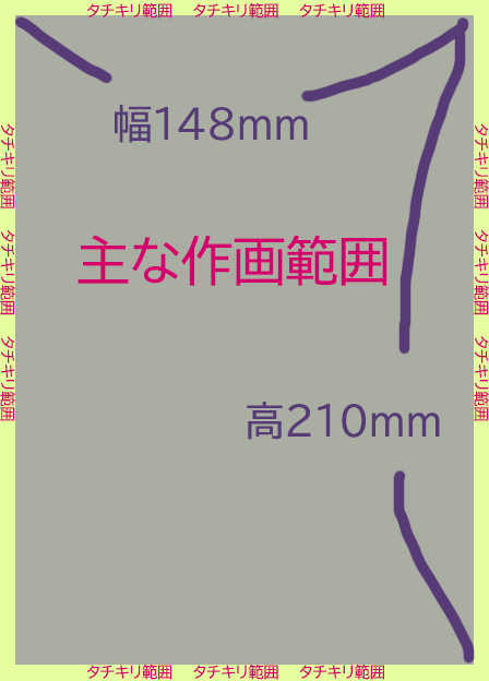 黄緑色→タチキリの範囲です。この辺りは本になった時断裁される部分ですが、紙端まで印刷が欲しい場合に書き込む部分です。