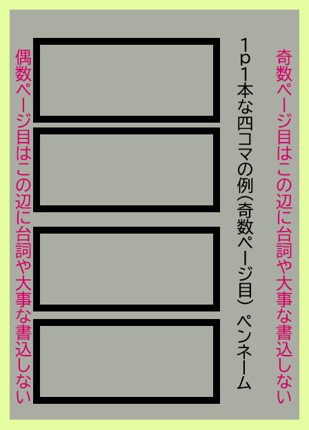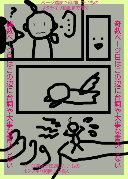 1・3・5~ページは右側、2・4・6~ページ目は左側が本の綴じ(ホチキスした)側になり、見えにくいです。この辺りには吹き出し、文字、表情など大事な物は置かないようにしてください。